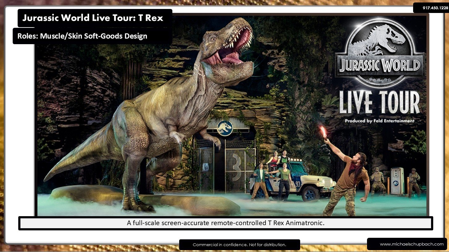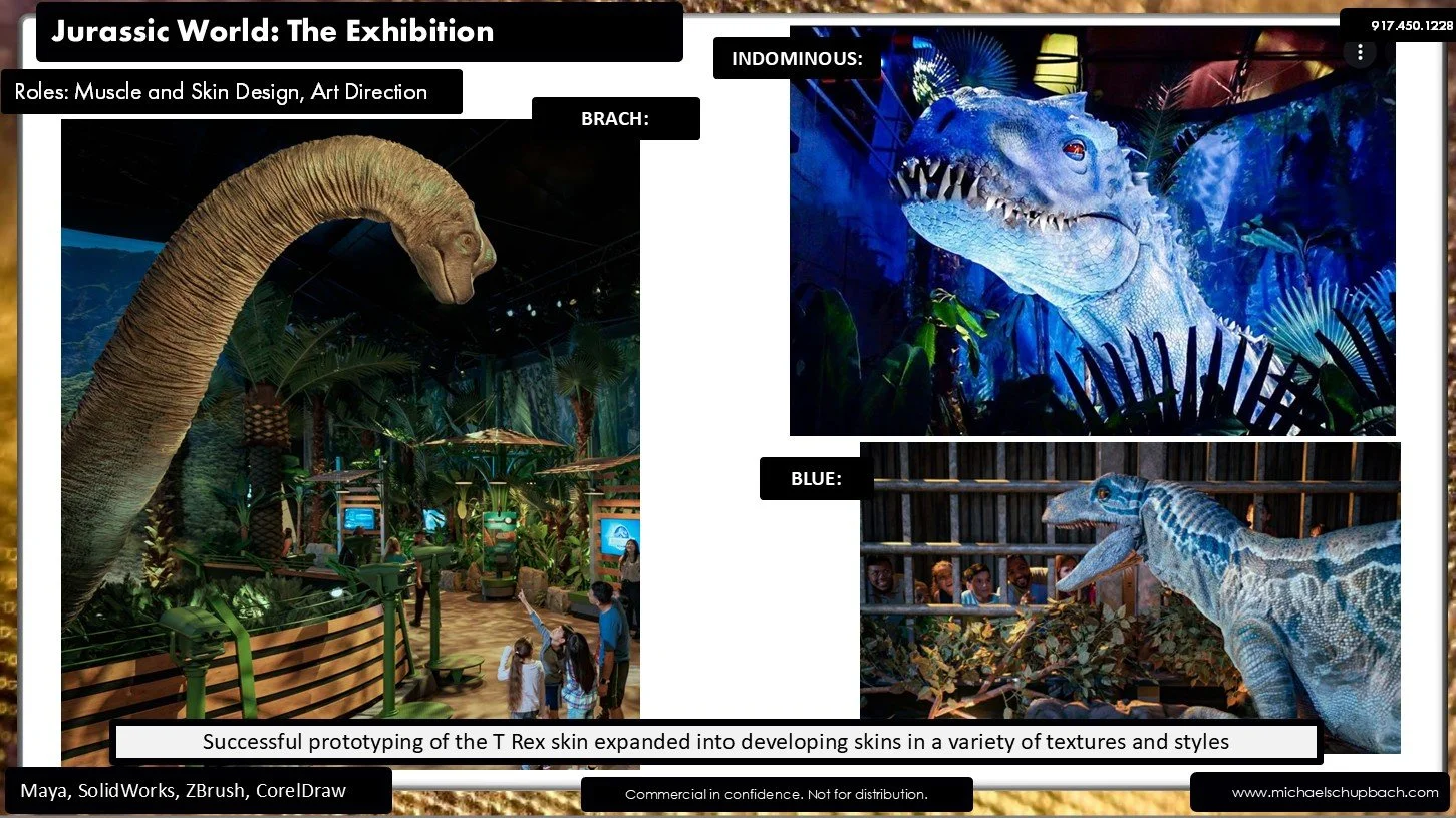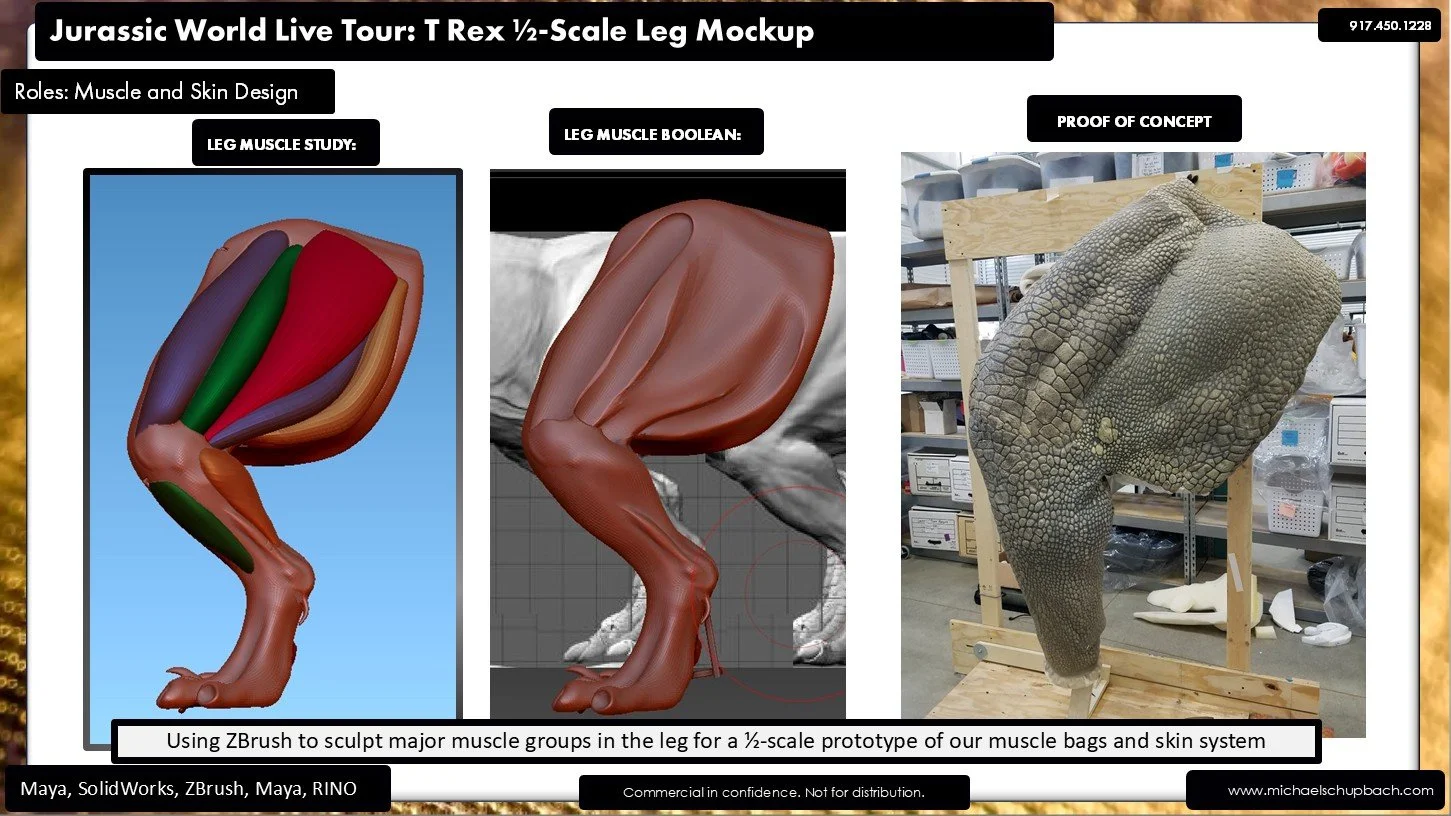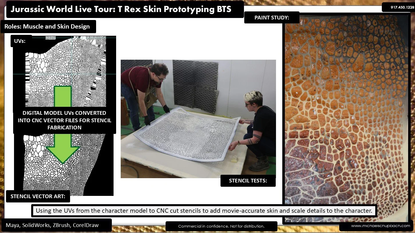 Concepts for muscle and skin systems for a full-scale animatronic T. rex. Created digital sculpts, paint tests, and UV-based stencil templates as a basis for eventual production.
